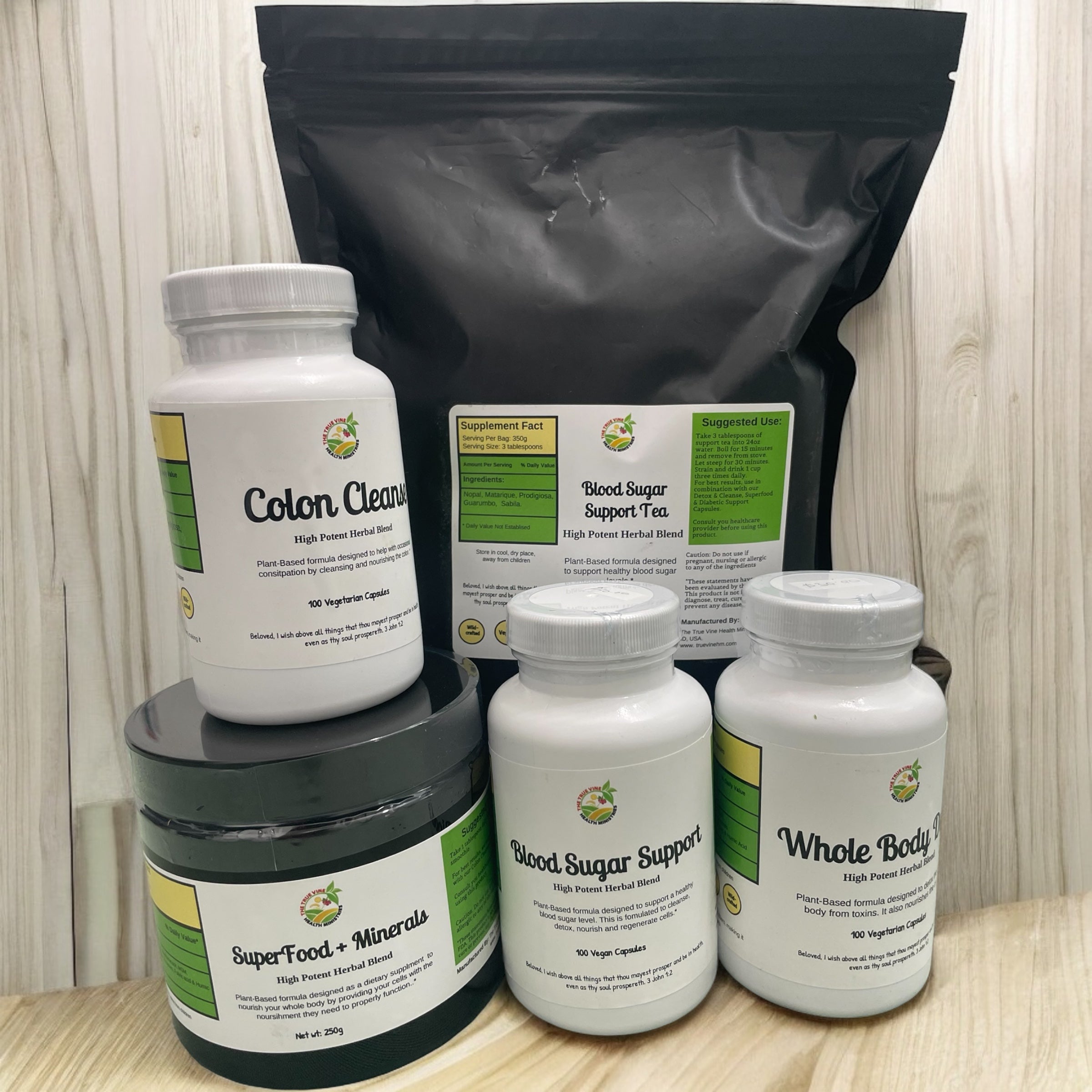 Introducing our Diabetic Support Kit, a holistic plant-based solution meticulously crafted to help manage blood sugar levels through cleansing, detoxifying, nourishing, and regenerating cells. This high-potency proprietary blend combines the power of nature's finest ingredients to support your journey towards better health.